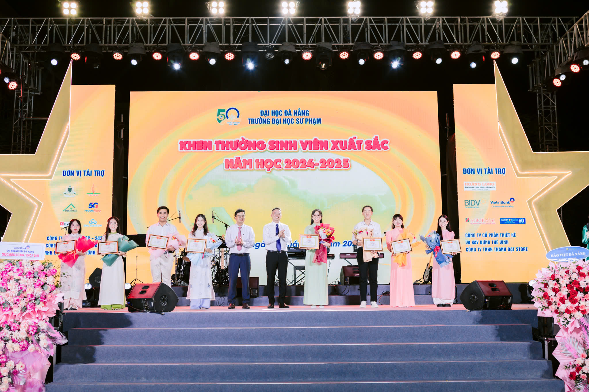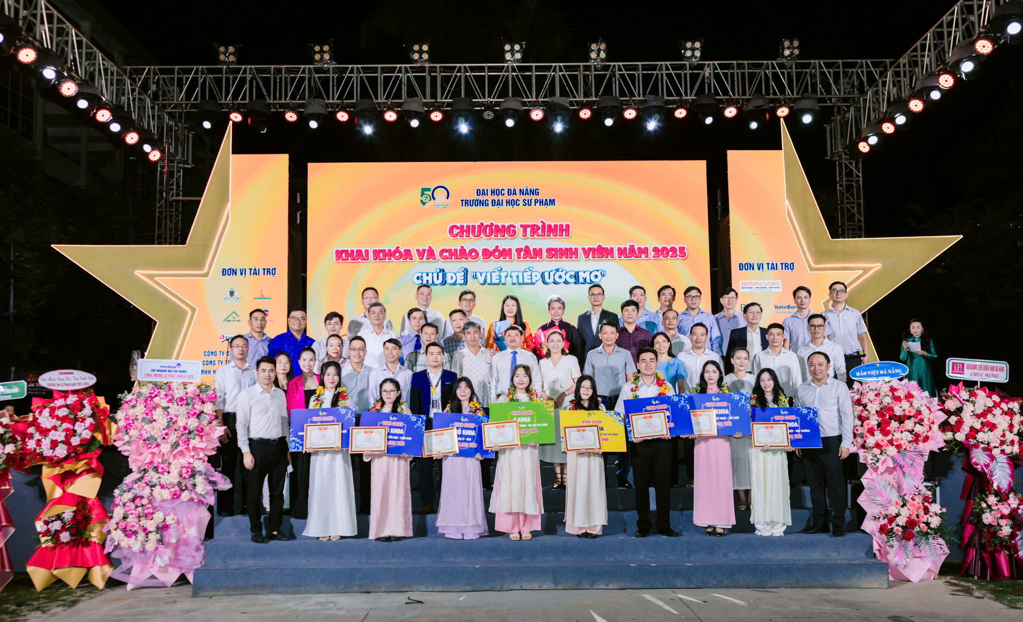 Chương trình khai khóa và chào tân sinh viên năm 2025 của Trường Đại học Sư phạm – ĐHĐN nhận được sự hỗ trợ, đồng hành của nhiều đơn vị tài trợ như: Ngân Hàng TMCP Đầu Tư Và Phát Triển Việt Nam Chi Nhánh Hải Vân; Ngân Hàng TMCP Công Thương Việt Nam Chi Nhánh Bắc Đà Nẵng; Ngân Hàng Nông Nghiệp Và Phát Triển Nông Thôn Việt Nam CN Liên Chiểu Nam Đà Nẵng; Công Ty Bảo Việt Đà Nẵng; Trung Tâm Anh Ngữ Mr Bean; Công Ty Cổ Phần Giáo Dục Quốc Tế Victoria – Australia… Đặc biệt, toàn bộ hạng mục sân khấu, âm thanh, ánh sáng của Chương trình được tài trợ bởi Công ty TNHH Âm thanh Ánh sáng Hoàng Long.