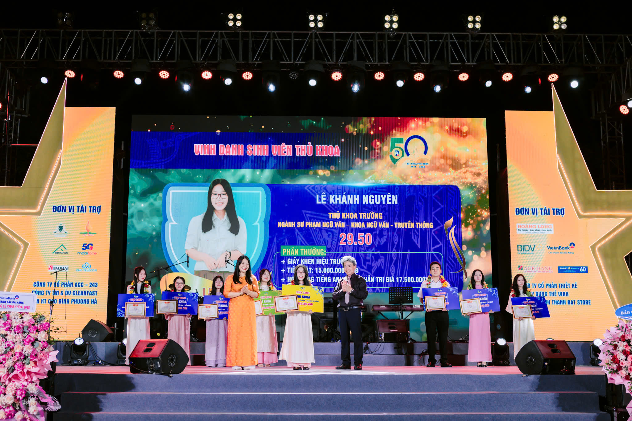 Tại Chương trình, Nhà trường đã vinh danh và khen thưởng thủ khoa Trường và thủ khoa khoa với tổng giá trị tiền thưởng 55 triệu đồng, trong đó thủ khoa Trường là 15 triệu đồng, á khoa Trường 10 triệu đồng và thủ khoa khoa 5 triệu đồng. Nhà trường cũng đồng thời khen thưởng cho 8 sinh viên xuất sắc toàn diện năm học 2024-2025, mỗi sinh viên 1 triệu đồng.